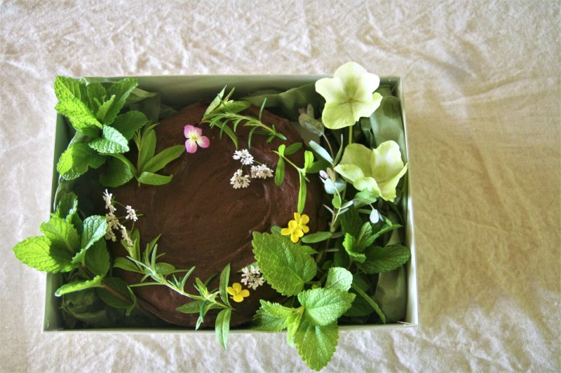 先日は、誕生祝のケーキの緩衝材に、庭のハーブと花を使いました。