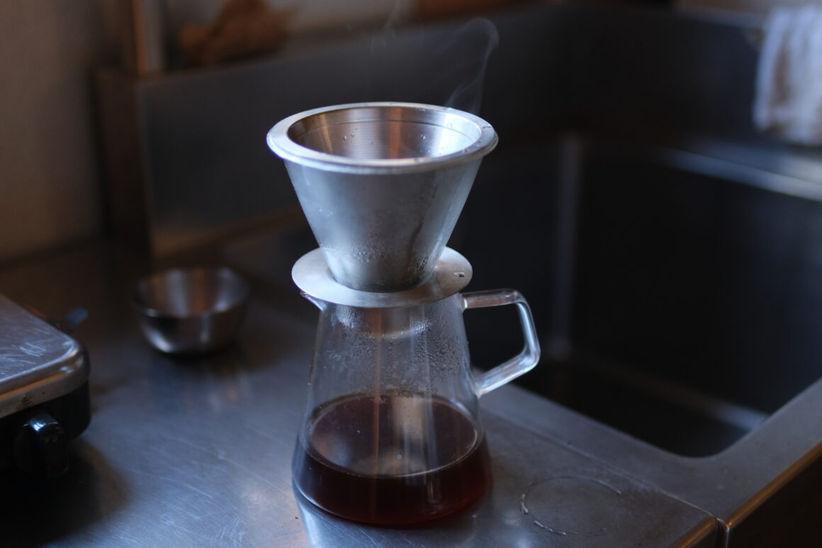ステンレスフィルターは、フレンチプレスと同じで「粉っぽさが気になる」という人もいますが、豆を少し粗めに挽く&最後の沈殿した部分を口に入れないようにすれば、個人的には特に気になりません。むしろ、ペーパーフィルターが漉し取ってしまうコーヒーの「油分」もちゃんと抽出できるので、「味わいがいい」とも言われるそうですよ(ペーパーやネルの「すっきり味」が好きな人もいると思うので、好みによると思いますが…)。
